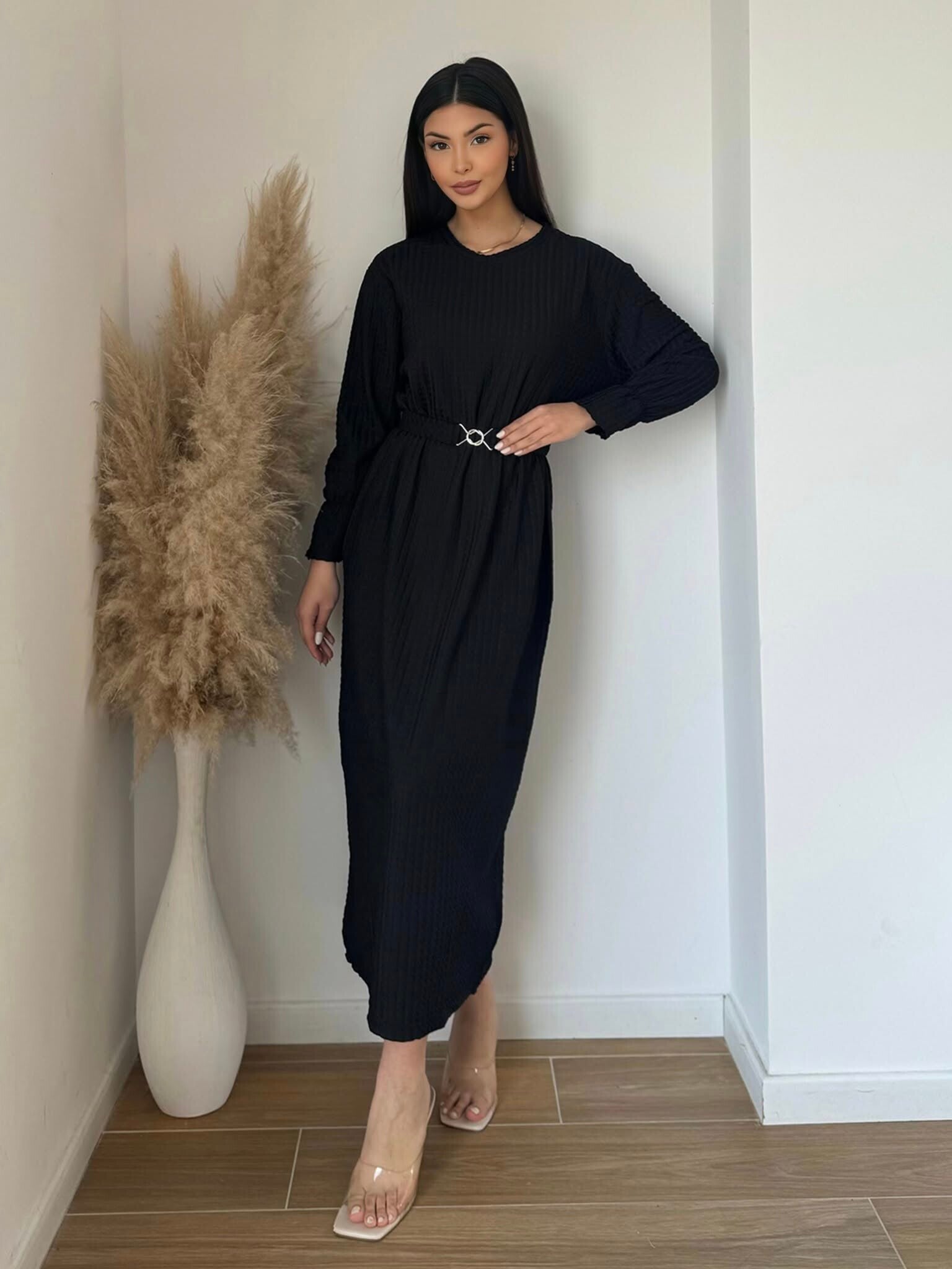 Izsmalcināta, vienkārša un tajā pašā laikā ļoti sievišķīga kleita ar vieglu tekstūru un akcentu jostas vietā.